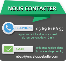 Vous pouvez nous contacter à l'adresse suivante: ebay (@) enveloppebulle.com ou par téléphone de 8h à 16h au : 03 69 61 66 55 (du lundi au vendredi)