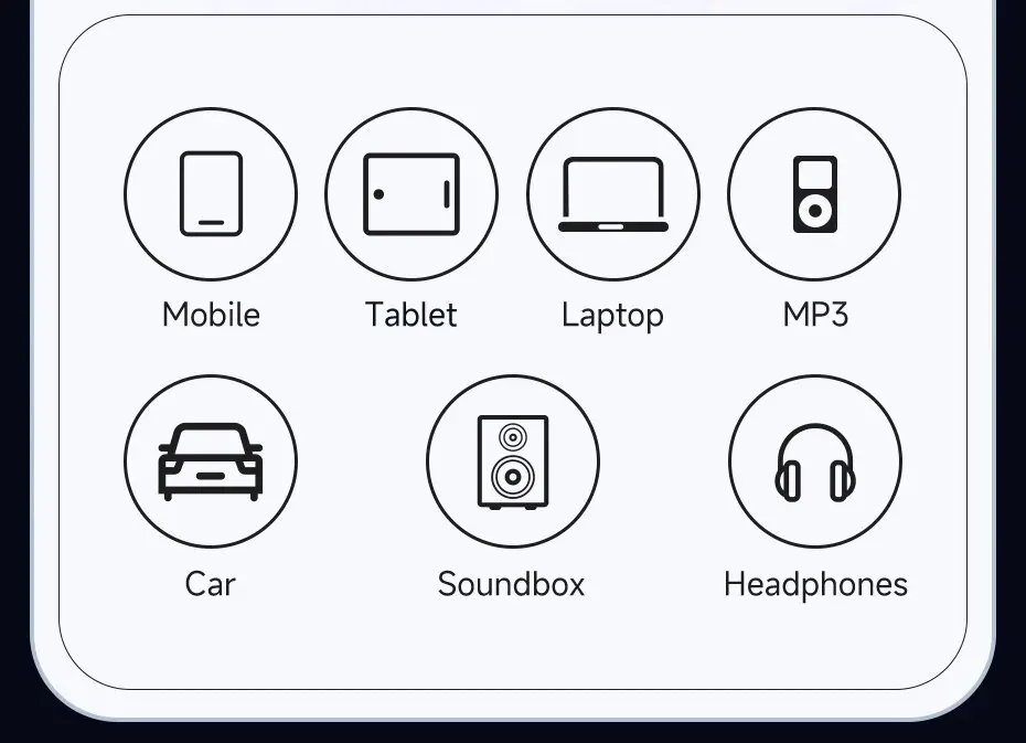 Mobile, Tablet, Laptop, MP3, Car, Soundbox, Headphones