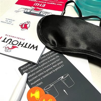Elementi di Gioco: 149 carte, 1 benda, 1 blocco segnapunti, 6 bicchieri, 1 penna, 1 clessidra, 40 segnalini punto, 1 supporto pallina, 1 pallina, 3 dadi.