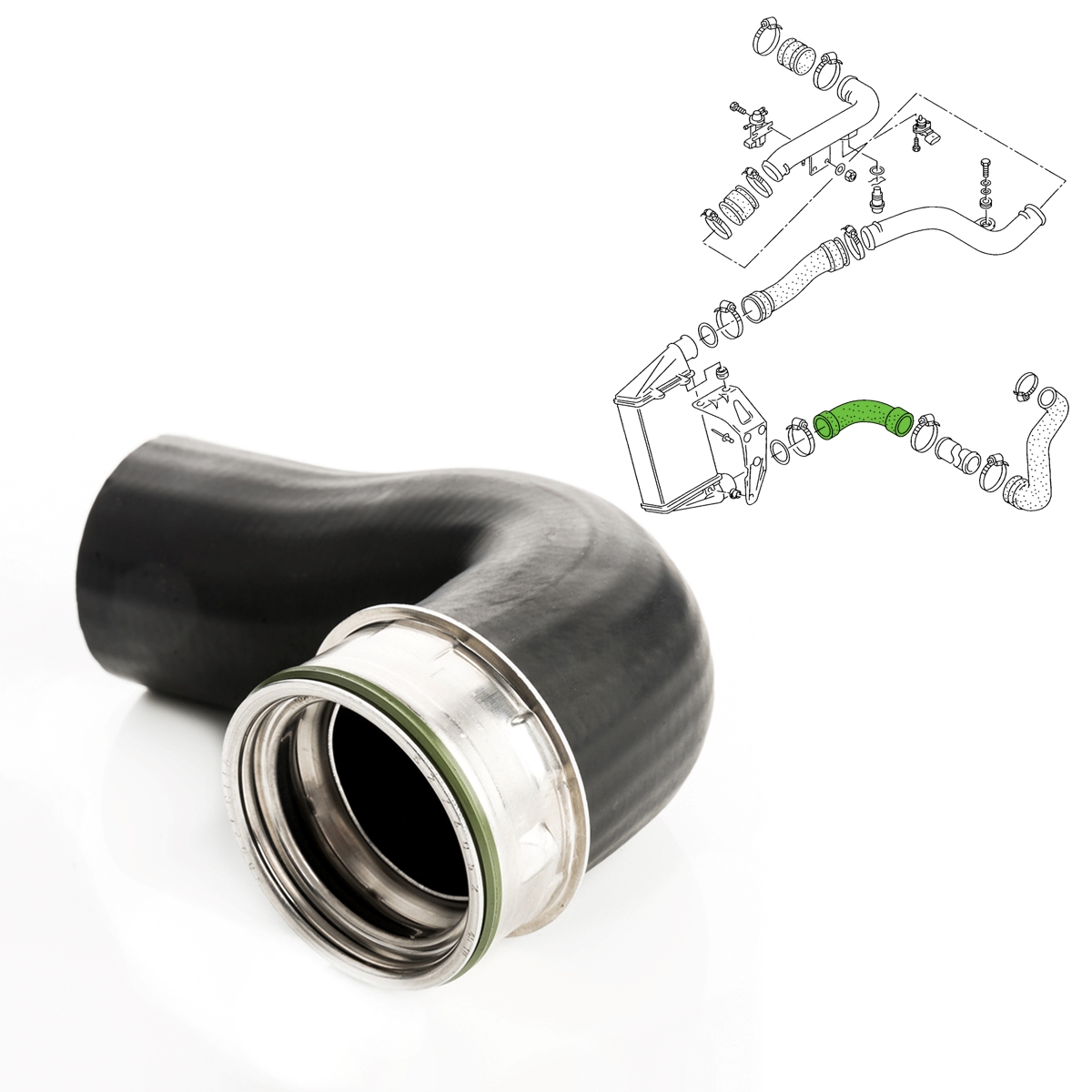 - für 1.8 T / 1.9 TDI Motoren - Einbauposition: Motorraum, Ladeluftkühler, unten - Material: Gummi mit Gewebeeinlage - Material Kompressionsring/Verdichtungsring: Edelstahl - Innen-Ø: ca. 48/49 mm - Außen-Ø: ca. 59/64 mm