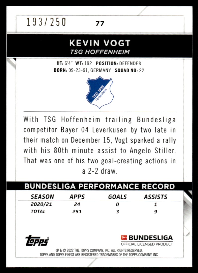 2021 Finest Bundesliga Aqua Refractor Kevin Vogt 173/199 TSG 1899 Hoffenheim