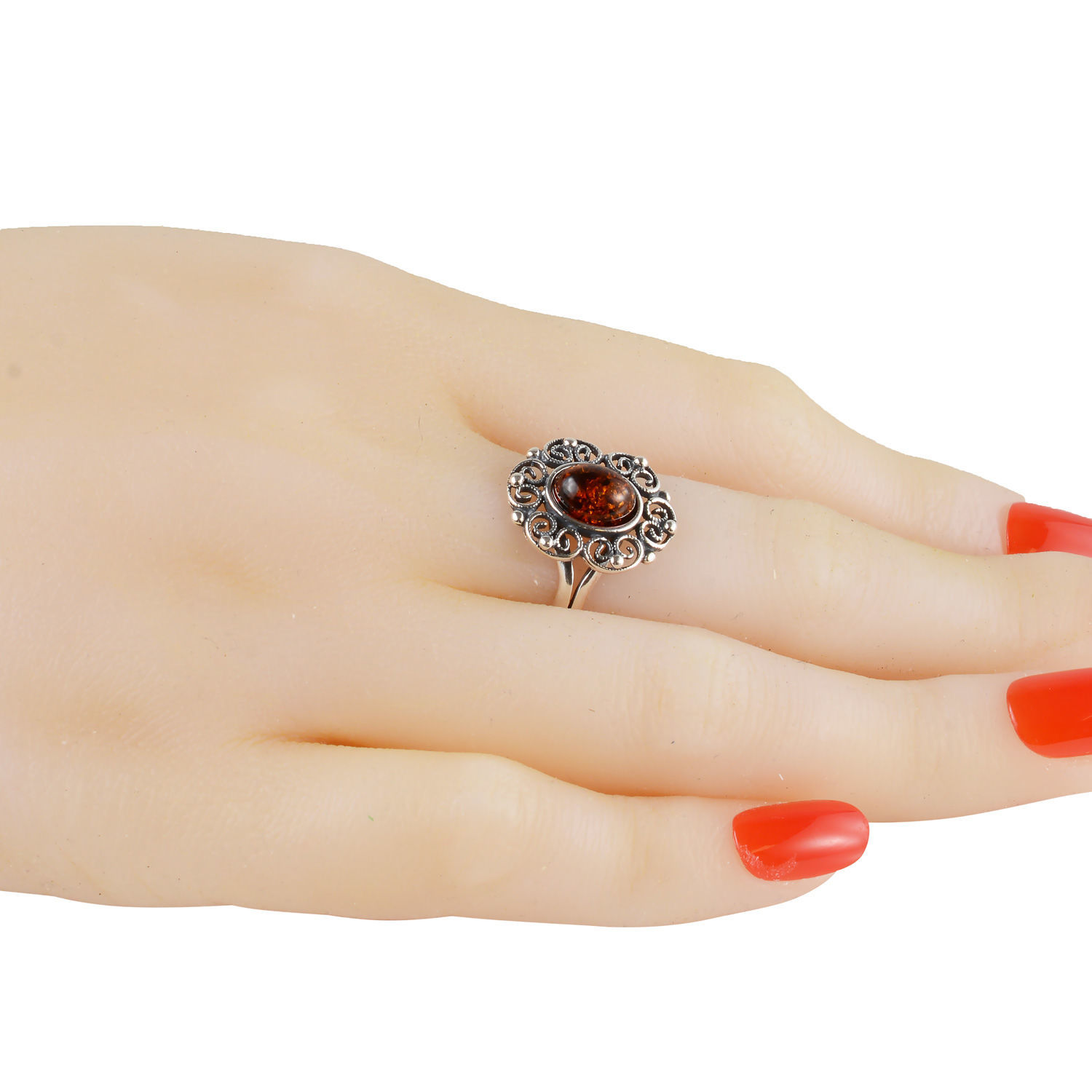 Looking for a statement ring that is both unique and stylish? Look no further than the oxidized sterling silver and Baltic honey amber ring "Gaelle"! This beautiful handcrafted ring features a stunning Baltic honey amber stone in the center, surrounded by intricate sterling silver swirls. The wide band makes this ring perfect for making special events, while the 2.5 g weight ensures it is comfortable to wear all day long. Add this piece to your collection of fine jewelry and enjoy knowing you are wearing a truly beautiful piece. Comes complete with a certificate of origin and arrives in a soft drawstring pouch, that can be used for gifting or storage. Please note that since amber is an organic stone, its color, shape, and inclusions may vary.
