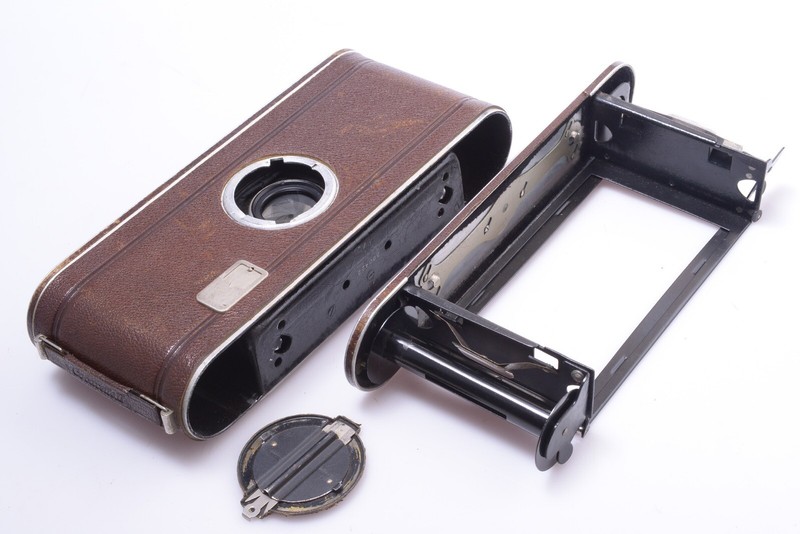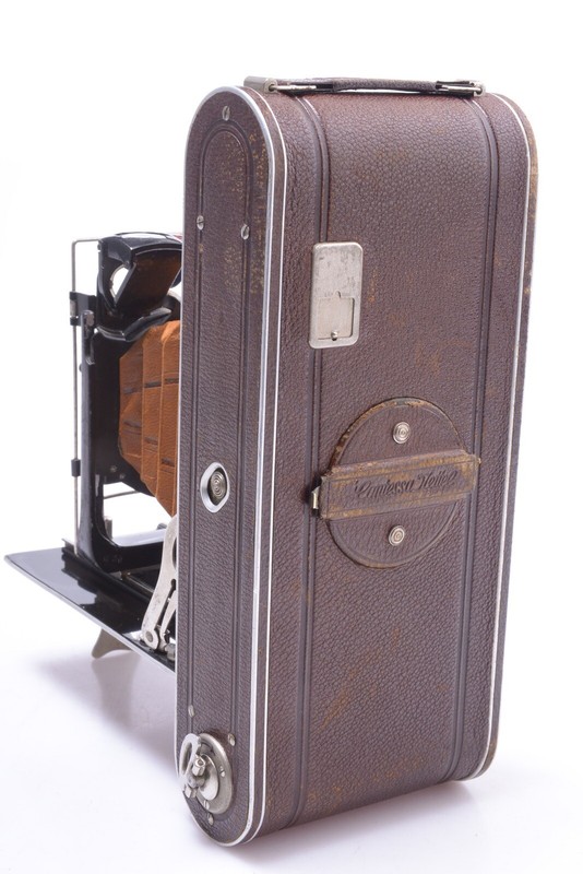 Camera shows some signs of prior use and is cosmetically in very good condition. Shows minor scuffs, few small scratches, no dings, no dents, no corrosion, minor paint rub off. Finder is in good, shows some spots, but is in pretty bright and clean condition. Wire frame finder original and in good condition. Bellows in light leak free condition. Original covers shows wear. Most scuffing at the cover at the rear.