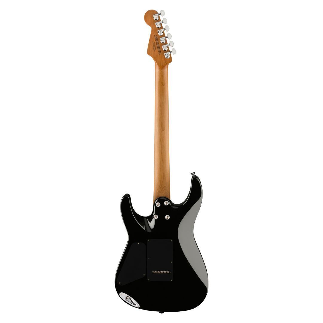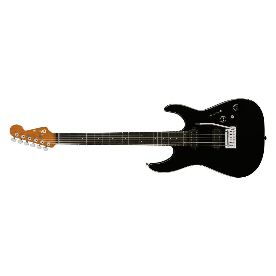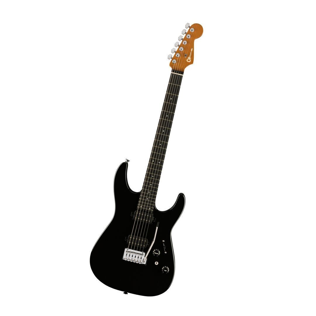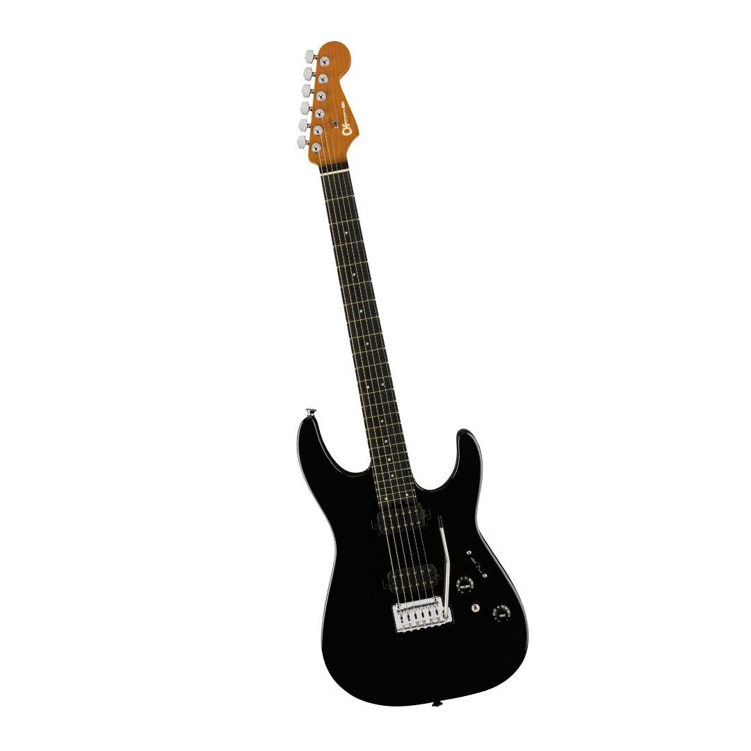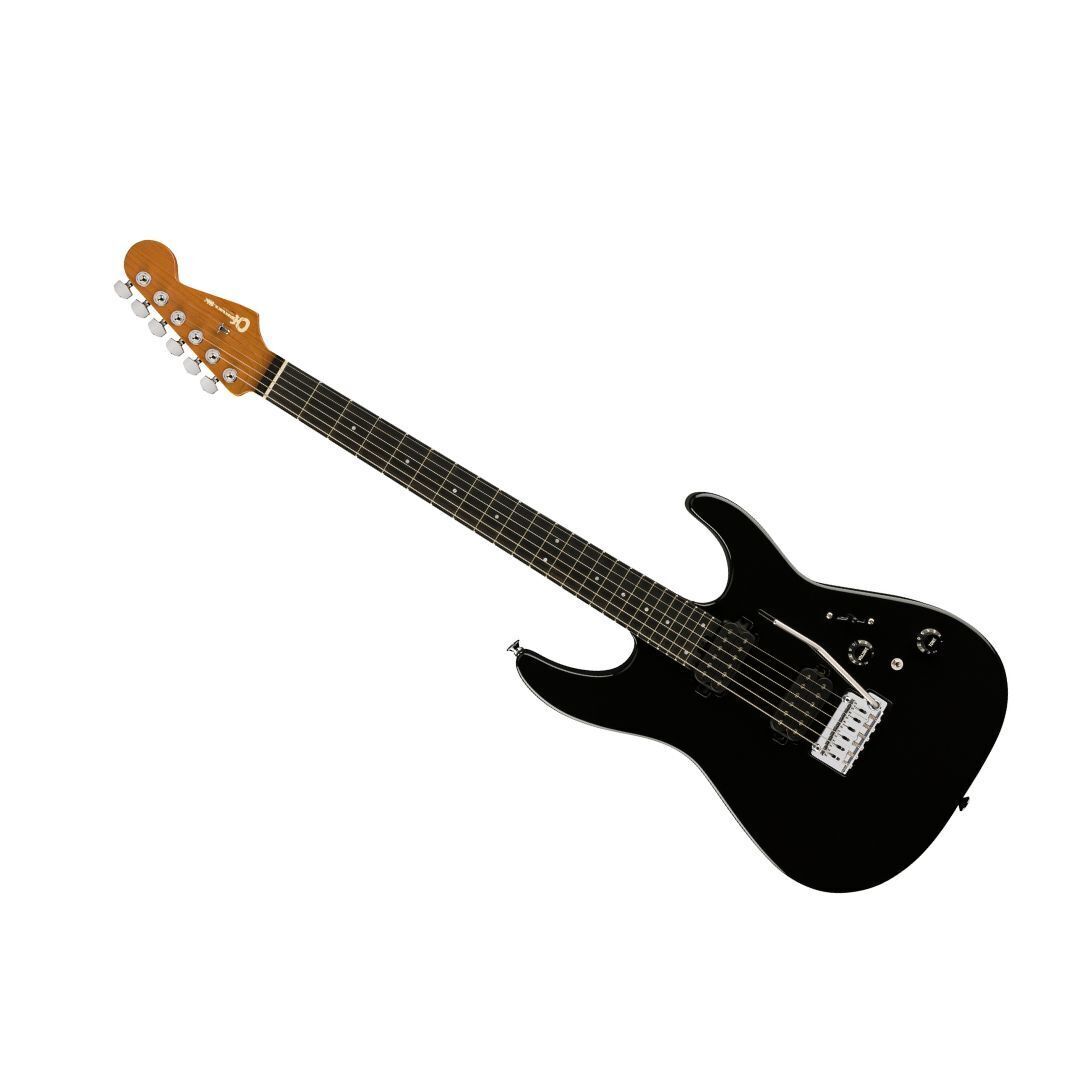 The bolt-on caramelized maple ‘speed’ neck on the Charvel ProMod DK24 HH 2PT EB 6-String Right-Handed Electric Guitar has graphite reinforcement, silky-smooth hand-rubbed urethane back finish, heel-mount truss rod adjustment wheel and Luminlay side dots. Its 12 to 16-inch compound radius ebony fingerboard features comfortable rolled edges, 24 jumbo frets, pearloid dot inlays and Graph Tech TUSQ XL nut. Brimming with versatility courtesy of the mini two-way toggle switch for series and parallel, this axe features an HH pickup configuration consisting of a direct mount Custom Seymour Duncan Full Shred TB-10 bridge pickup and direct mount Seymour Duncan Alnico II Pro APH-1N neck pickup. The bridge pickup radiates a crisp top-end with low-end articulation, while the neck pickup has incredible range with soaring highs and silky lows. Blending sophisticated style with assertive tone, the DK24 HH 2PT EB also offers premium modern features such as a five-way blade pickup switch, Stratocaster style skirt knobs for the volume (with 500K EVH Bourns low-friction potentiometer) and no-load tone controls, Gotoh Custom 510 recessed tremolo bridge, locking tuners, chrome hardware and more. It is available in Gloss Black with chrome hardware.