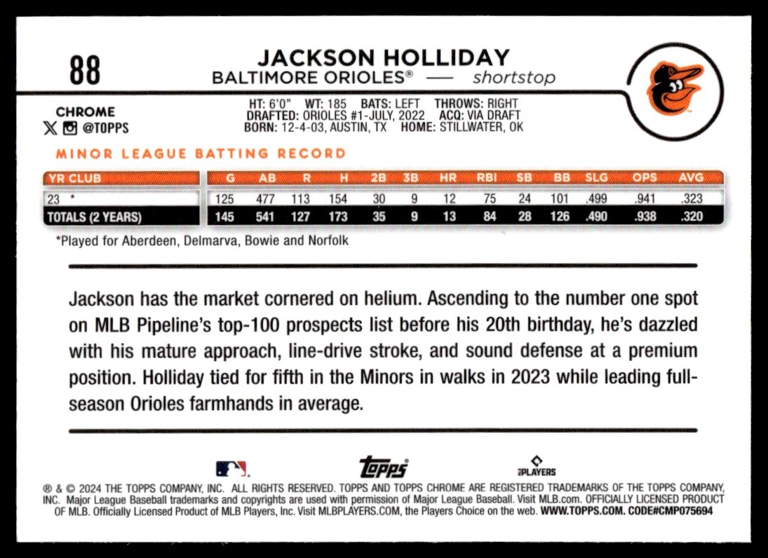2024 Topps Chrome Jackson Holliday Rookie Baltimore Orioles #88