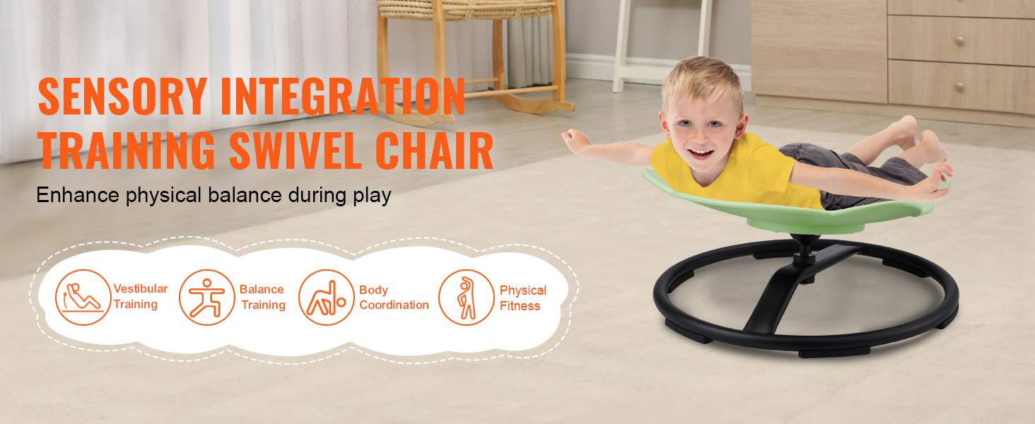 This 360° swivel chair engages children's vestibular systems, enhancing coordination and balance. It features a sturdy 20.5-in metal base, supports up to 220 lbs, and has a padded seat for comfort. The anti-slip design and smooth edges ensure security. Easy to assemble, it's ideal for home.