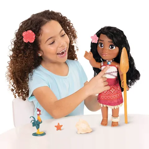 Join Moana on new adventures with My Singing Friend Moana & Heihei. Your favorite wayfinder from Disney’s Moana 2 comes dressed in an all-new fashion that’s perfect for travel across the ocean. Bring along Moana’s oar and conch shell, and style her hair and yours with island-inspired hair clips. Imagine the sea breeze as you listen to Moana doll speak to you and sing along to new song, “We’re Back.” And don’t forget Heihei, who makes every journey even more unexpected and exciting.