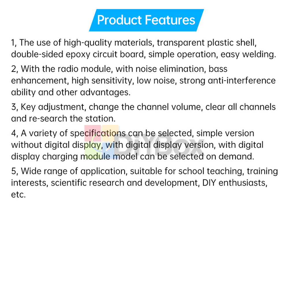Features1、Using high-quality materials, transparent plastic shell, double-sided epoxy circuit board, simple operation, easy welding.