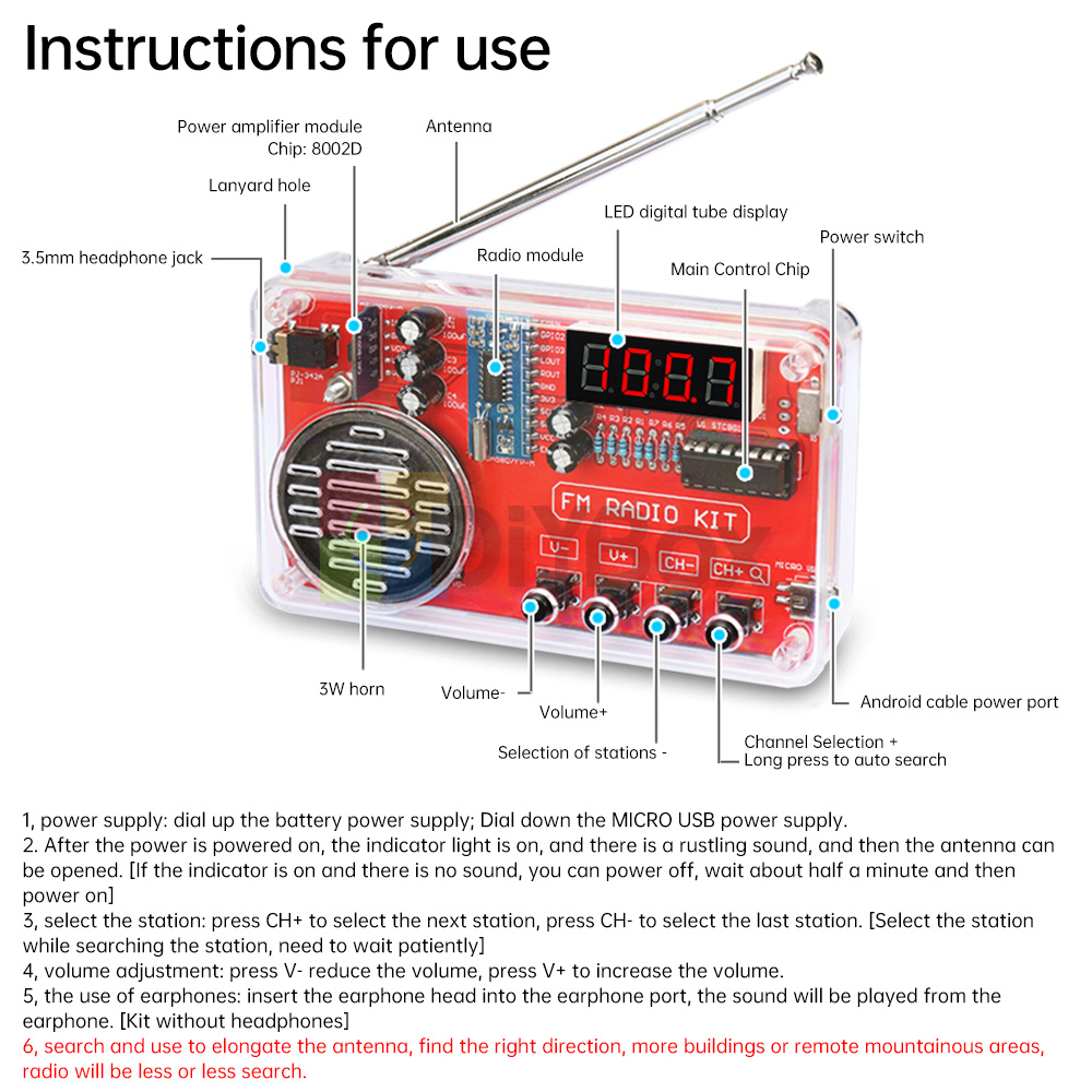 6, Search for stations and use to stretch the antenna to find the right direction, places with a lot of buildings or remote mountainous areas, the radio station will be less or can not be searched.