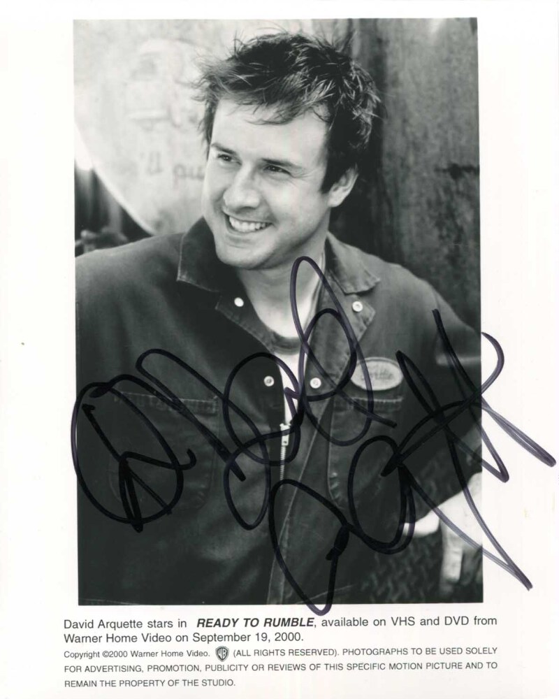 Signed publicity photograph, shows David Arquette in a film scene in `Ready to Rumble`, 8 x 10 inch, signed in black felt tip, in very fine condition.