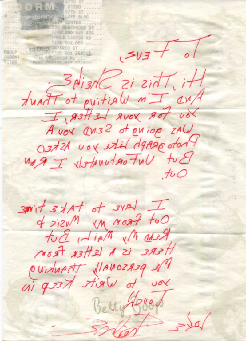 I love to take time out from my music & read my mail, but here is a letter from me personally thanking you to write. Keep in touch.