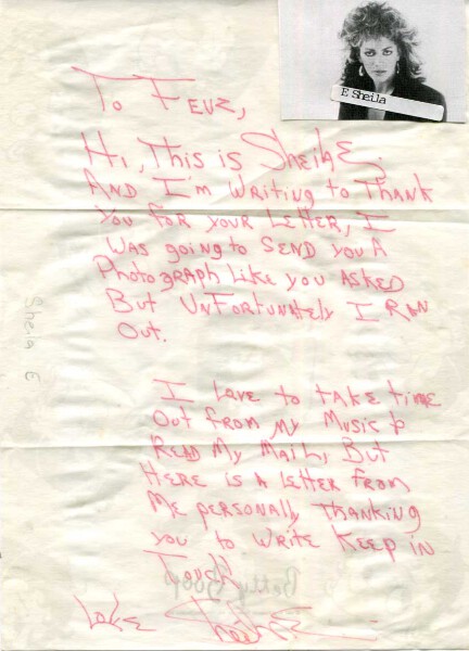 Hi, This is Sheila E. and i`m writingto thank you for your letter, i was going to send you a photograph like you asked but unfortunately i ran out.