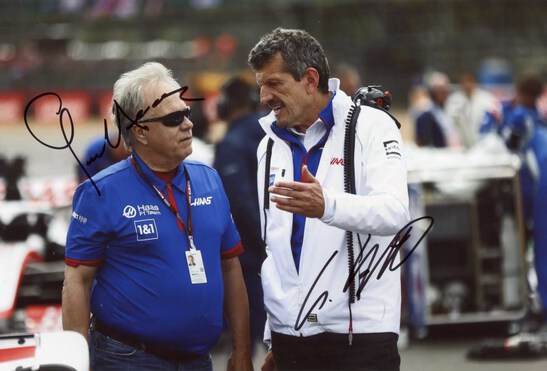 IP signed photograph, shows Guenther Steiner and Gene Haas at an event, 12 x 8 inch, obtained In-Person, signed by both in black felt tip, in very fine condition.