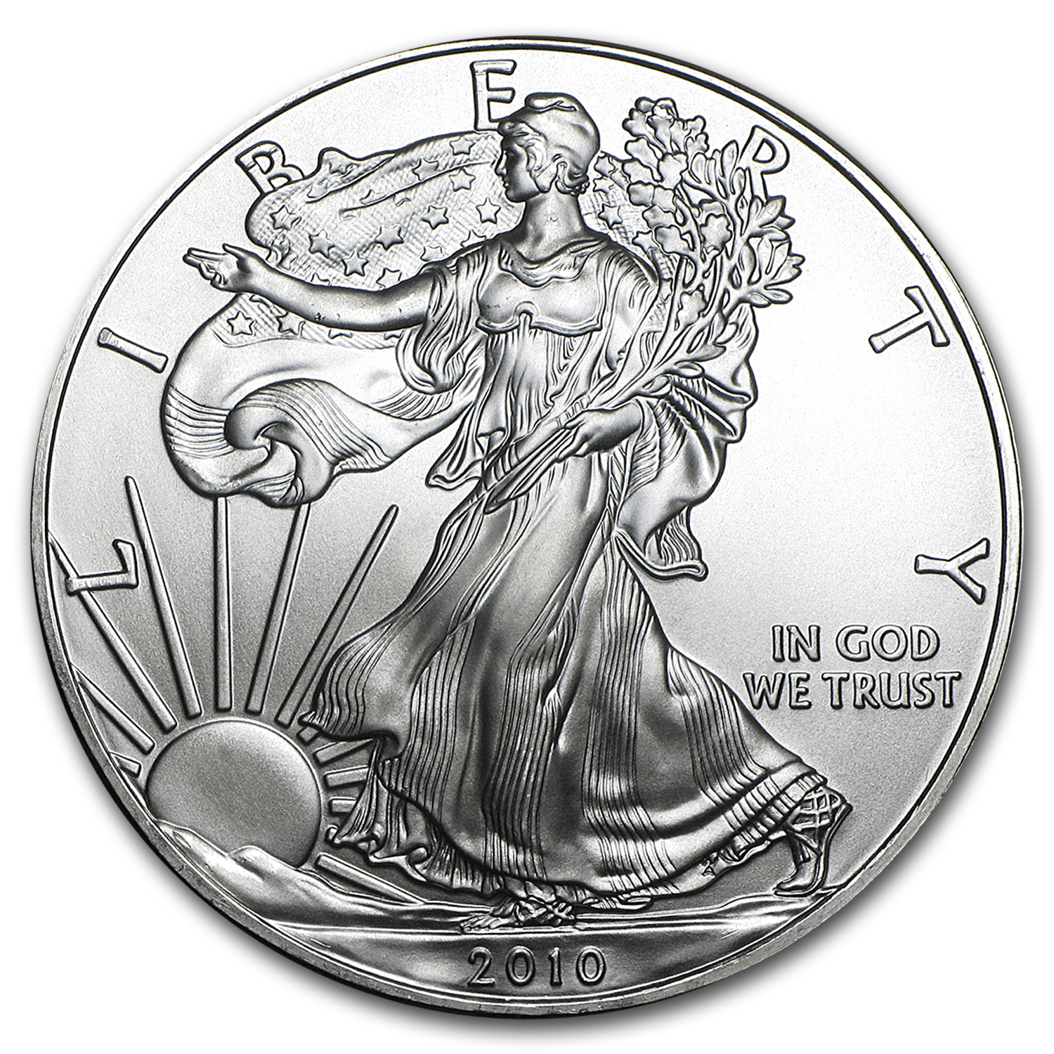 - Obverse: Adolph A. Weinmans design showing Lady Liberty draped in an American flag, walking gracefully as the sun rises over a ridge.