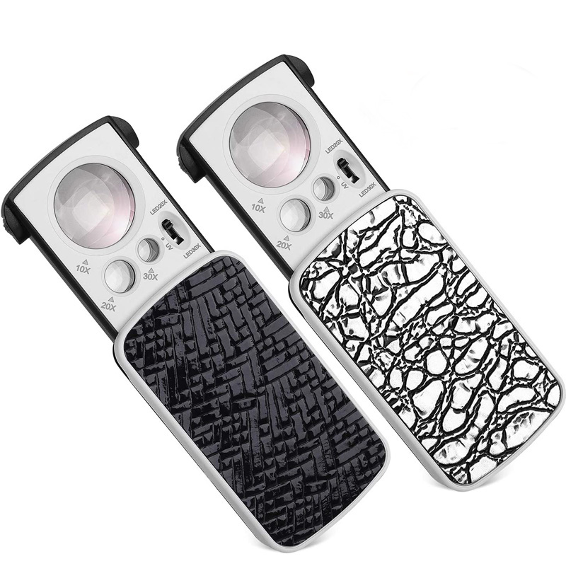 Description: Portable Handheld Lightweight 30X 60X 90X Magnifying Glass Foldable Optical Lens Jewelry Appraisal Reading Monocle Magnifier Loupe with UV LED Feature: There are 3 magnifications: 30X, 60X, and 90X. 2 LED lights and 1 UV currency detector light for counterfeit currency detection. Fine workmanship, good performance, small size, and easy to carry. It is suitable for jewelry appreciation and paper currency inspection. Specification: Material: ABS plastic, leather, acrylic optical lens Product size: 85*46*18mm (folded), 133*46*18mm (opened) Lens diameter: 25mm, 12mm, 8mm Magnification: 30 times, 60 times, 90 times Battery model: 3 X LR44 button batteries Color: Black, Silver Package Included: 1 X Magnifying Glass Note: Due to the different monitor and light effects, the actual color of the item might be slightly different from the color shown in the pictures. Thank you! Please allow 1-2cm measuring deviation due to manual measurement.