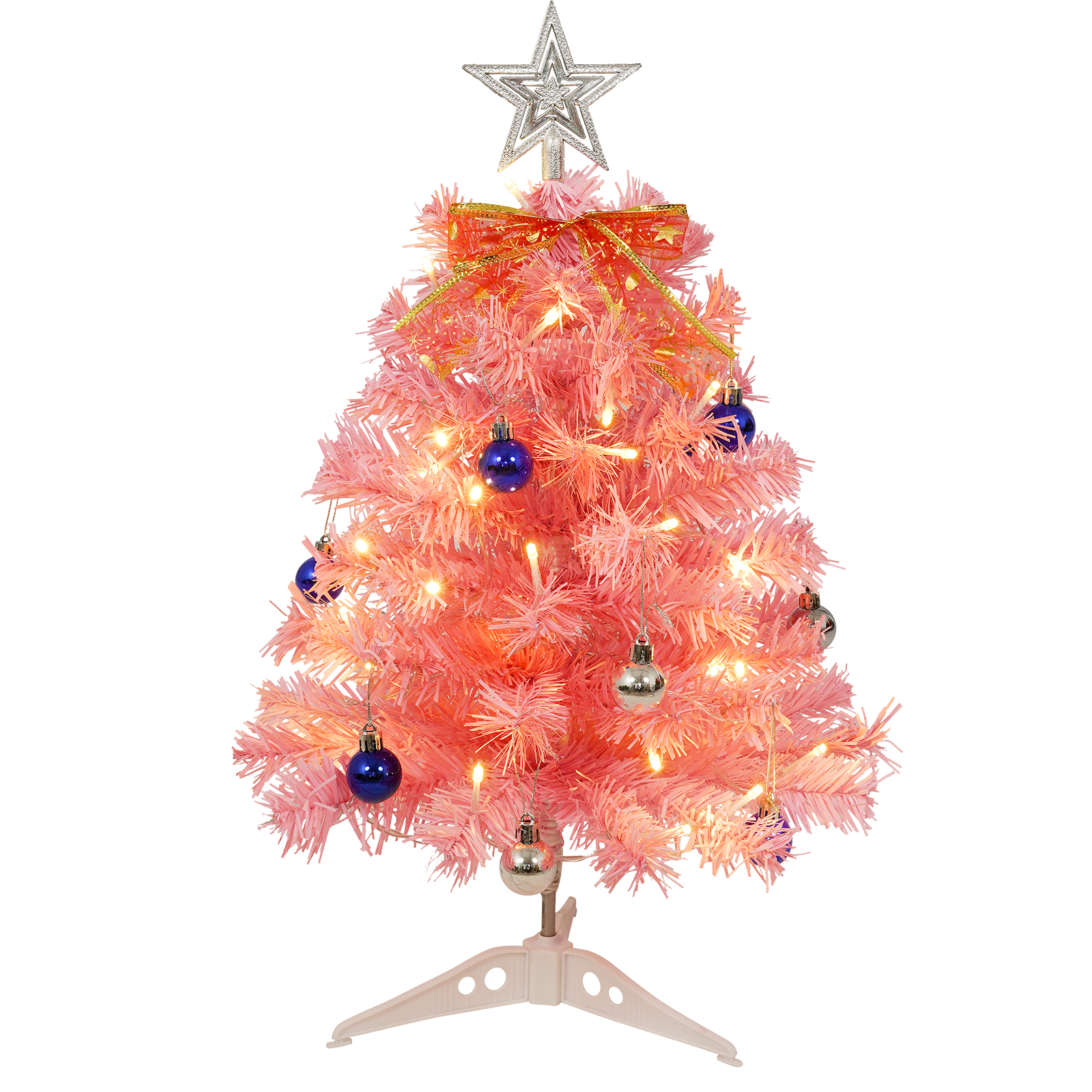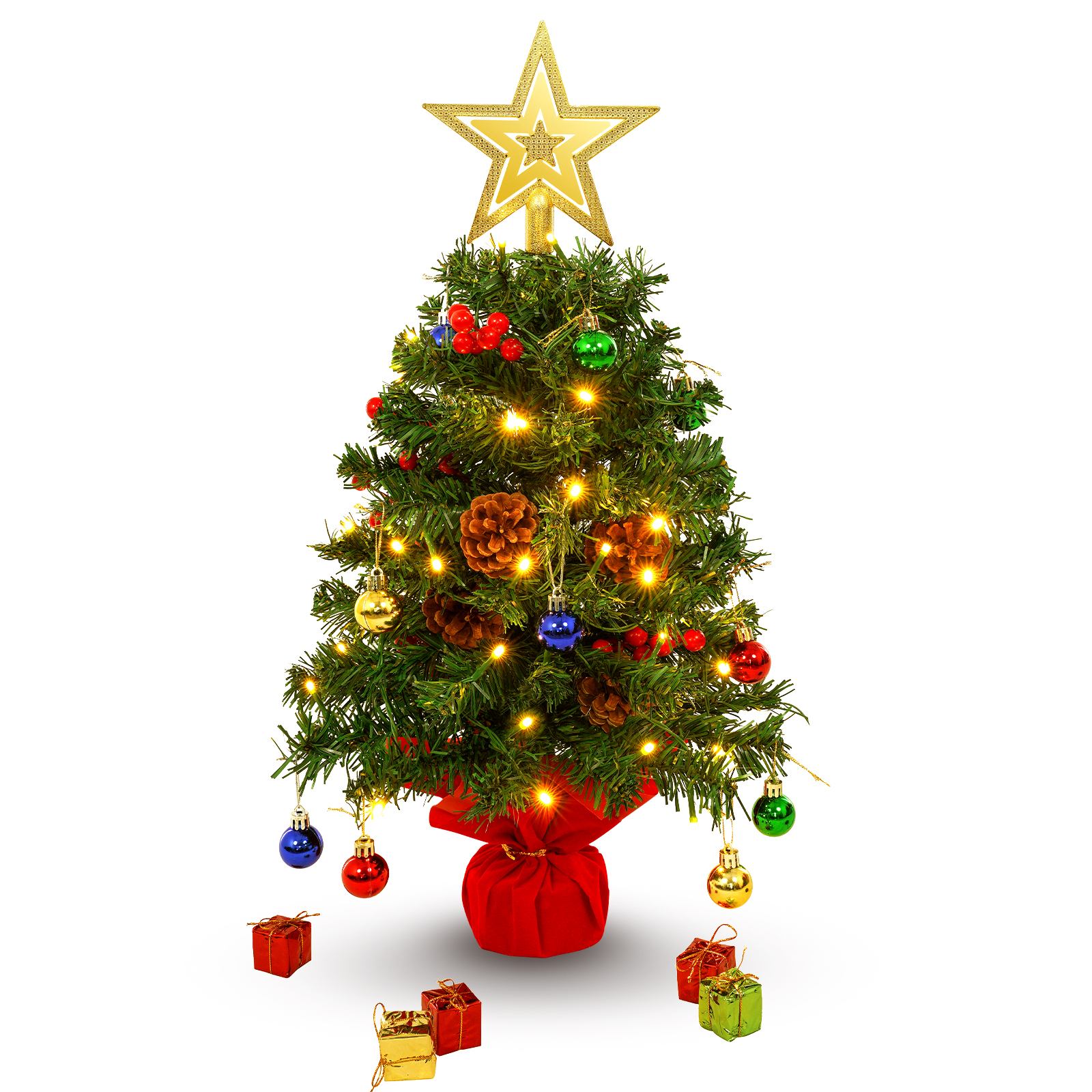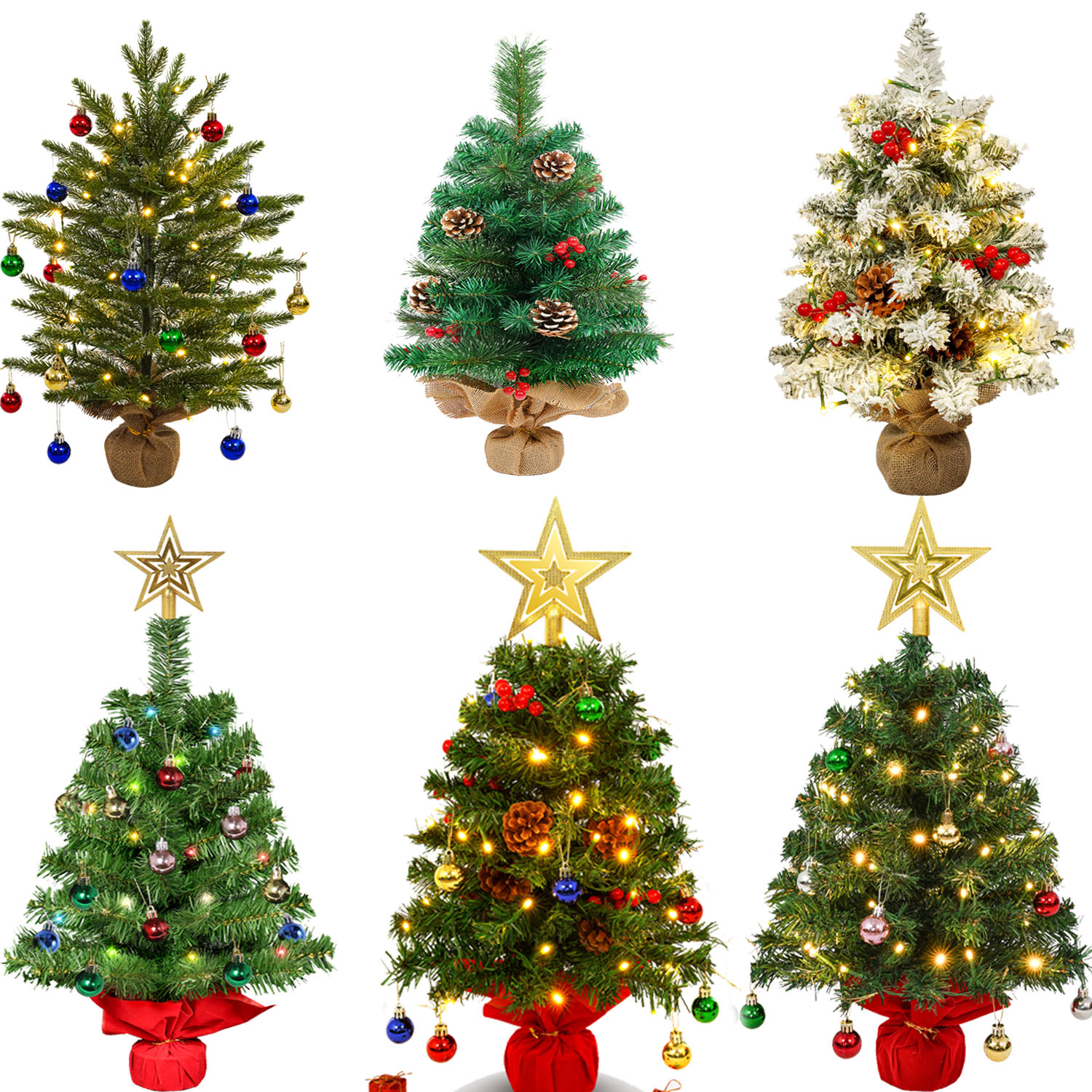 These trees size is 21.65/23.62 Inch, with a variety of Christmas ornaments and Led light which make it looks brilliant and full day and night. Warm lights can add a Christmas atmosphere to your home or office