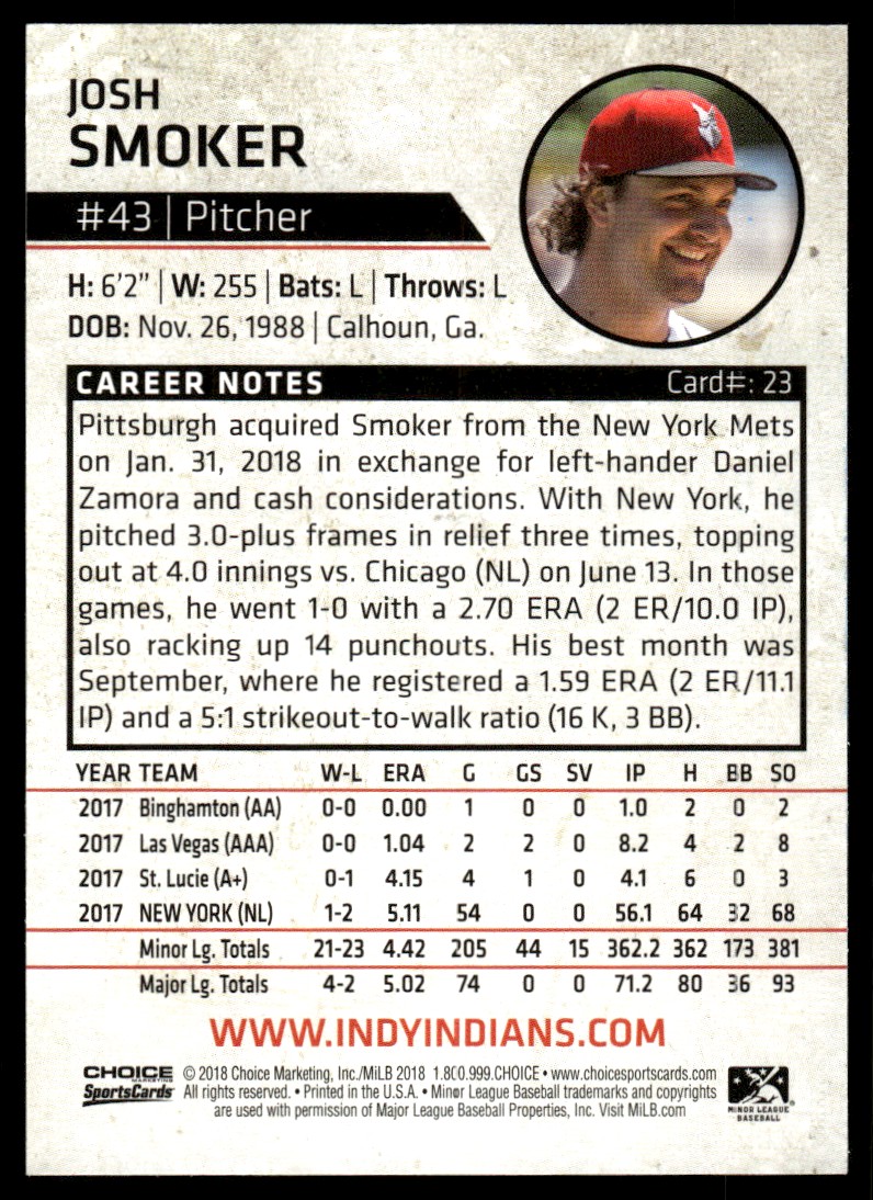 | 2018 Choice Baseball Card Josh Smoker Indianapolis Indians #23 Signed |