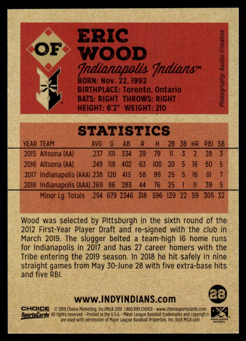 | 2019 Choice Baseball Card Eric Wood Indianapolis Indians #28 Signed |