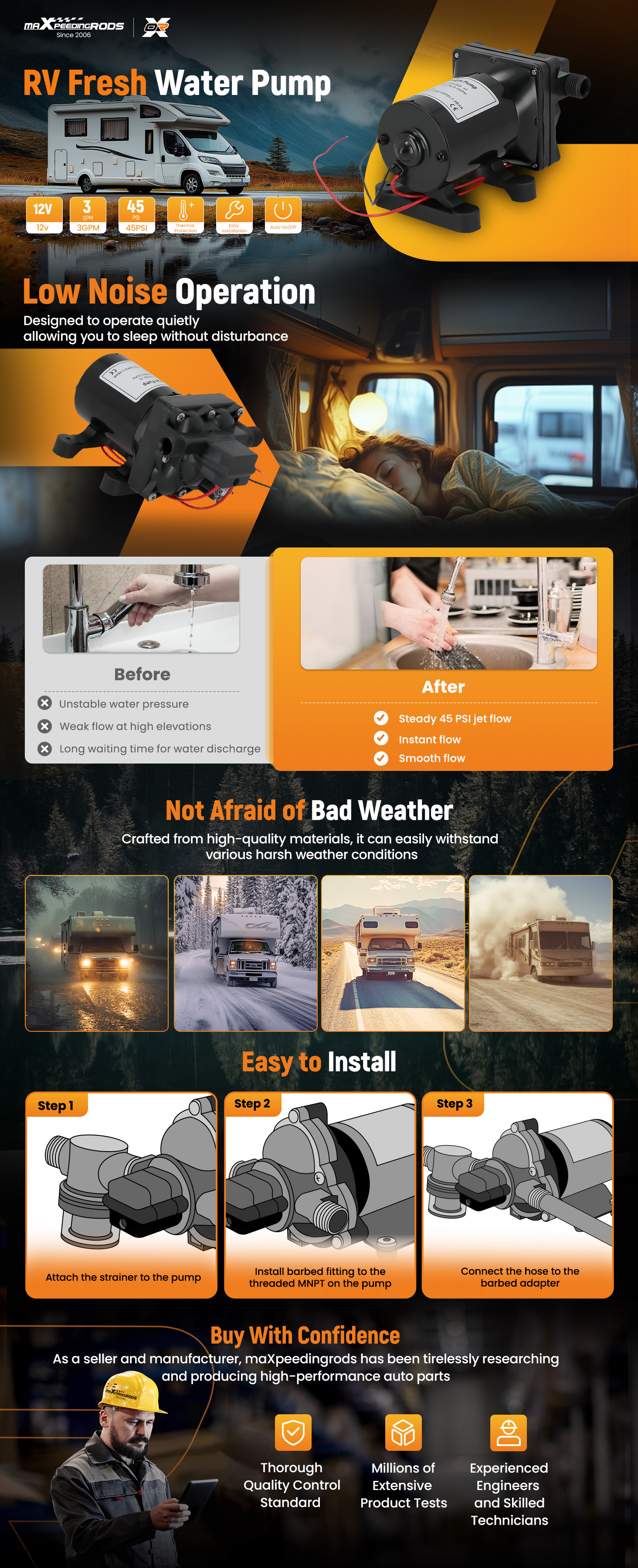 Boasts a 3.0 GPM (gallons per minute) flow rate, ensuring a strong and steady water supply for your recreational vehicle, which is crucial for a comfortable travel experience.
