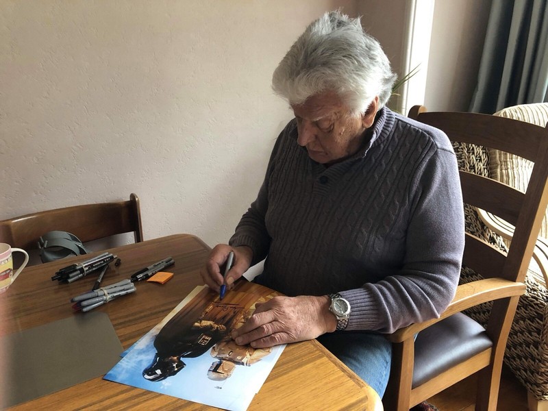 Autographed color photograph 11x14 signed in silver permanent marker by actor David Prowse (died 2020) and inscribed “Darth Vader”. From the Steve Grad Autograph Collection and obtained in person by Steve Grad at a private signing. The autograph has been certified by Beckett Authentication services #BH39086