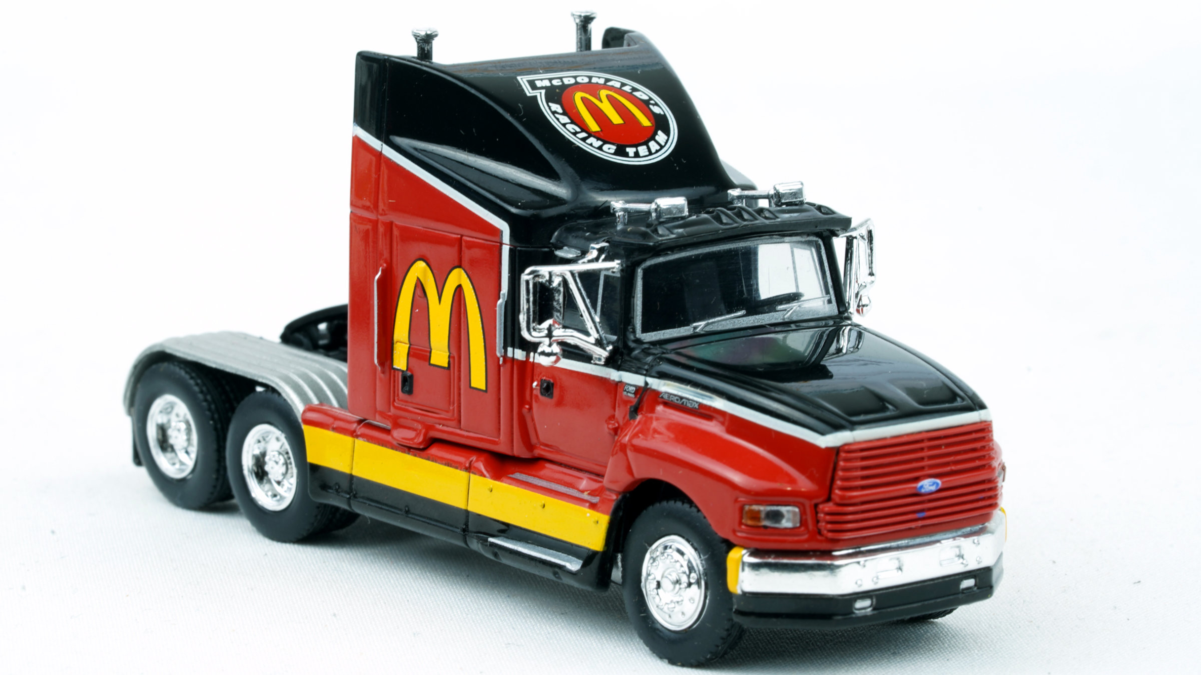 Brekina Ford LTLA-9000 tandem axle truck tractor 120" BBC cab, 60" sleeper Prototype produced from 1988 to 1995 Bill Elliott/McDonalds Racing Team paint scheme Chrome mirrors (buyer installed) Chrome grille, bumper, trim Chrome full fenders on the rear Dual chrome exhaust stacks Dual chrome horns Alcoa style 10 aluminum type wheels September 2024 release New in box SKU #85903