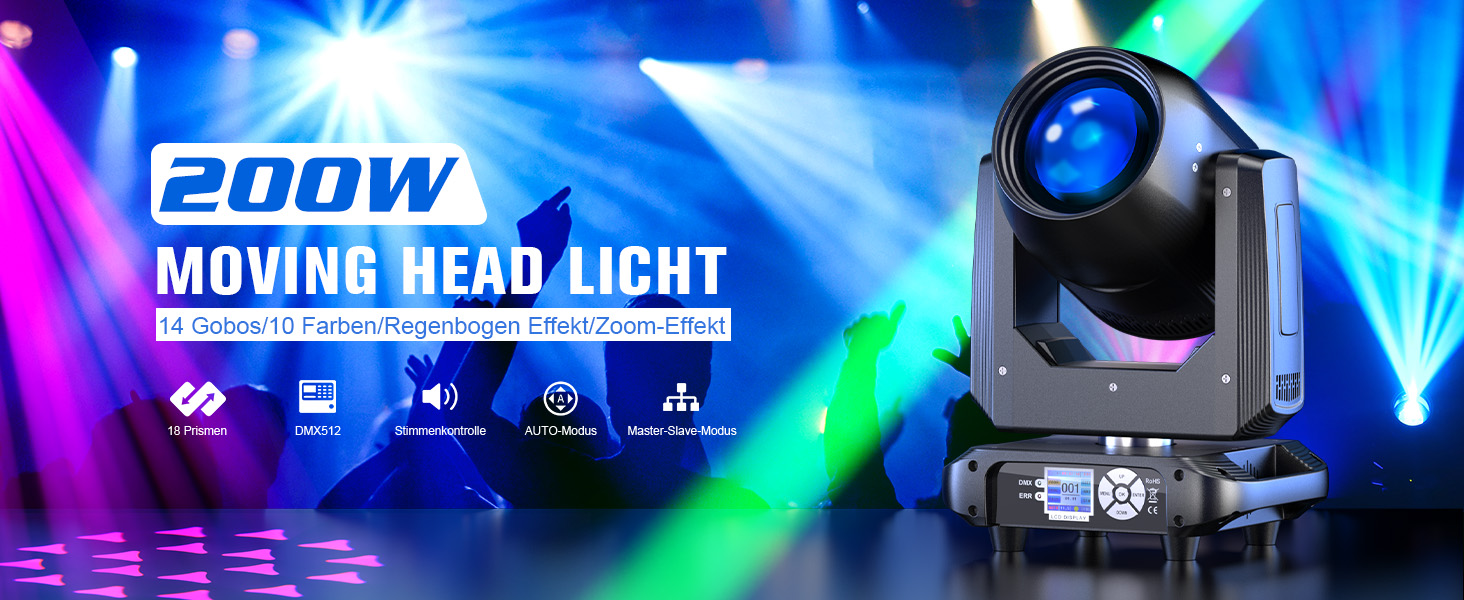 Anwendungsbereich: Geeignet für Bankettsäle, Hochzeitsorte und Theater, um die Aufführung noch auffälliger zu machen. In Kombination mit anderen Beleuchtungsgeräten lässt sich leicht eine einzigartige und bezaubernde Atmosphäre schaffen. Produktbeschreibung: Das Moving Head Light ist ein leistungsstarkes und vielseitiges Beleuchtungsprodukt, Es verfügt über eine 200-W-LED-Modullichtquelle, die hohe Helligkeit, hervorragende Lichtausbeute und starke Strahleneffekte bietet. Das LED-Modul gewährleistet eine lange Lebensdauer und unterstützt lineares Dimmen von 0 bis 100 %. Diese Leuchte ist mit einem 9+1-Farbrad, einem 13+1-Musterrad, einem 18-Facetten-Prisma und einem Regenbogeneffektfilter ausgestattet, wodurch mehrere Effektkombinationen möglich sind. Das Farbrad unterstützt verschiedene Modi, während das Musterrad die Modi Flow, Jitter und Rotation unterstützt. Das Prisma kann sich kontinuierlich um 360° drehen und erzeugt so einen Regenbogeneffekt. Die Leuchte bietet mehrere Steuerungsmodi, darunter Automatik, Soundaktivierung, Szene, Master/Slave und DMX. Es verfügt über elektronischen Fokus, RDM-Funktionalität, intelligentes Zurücksetzen der XY-Achse, einstellbare Tonempfindlichkeit und die Möglichkeit, bis zu 10 Szenen manuell zu speichern. Es hat einen umfassenden Scanbereich ohne tote Ecken und ein benutzerfreundliches Design mit einem zweisprachigen LCD-Bildschirm. Das 200-W-Moving-Head-Licht ist eine zuverlässige und funktionsreiche Beleuchtungslösung, die für Live-Auftritte, Konzerte, Veranstaltungen und Installationen geeignet ist, die dynamische Lichteffekte erfordern.