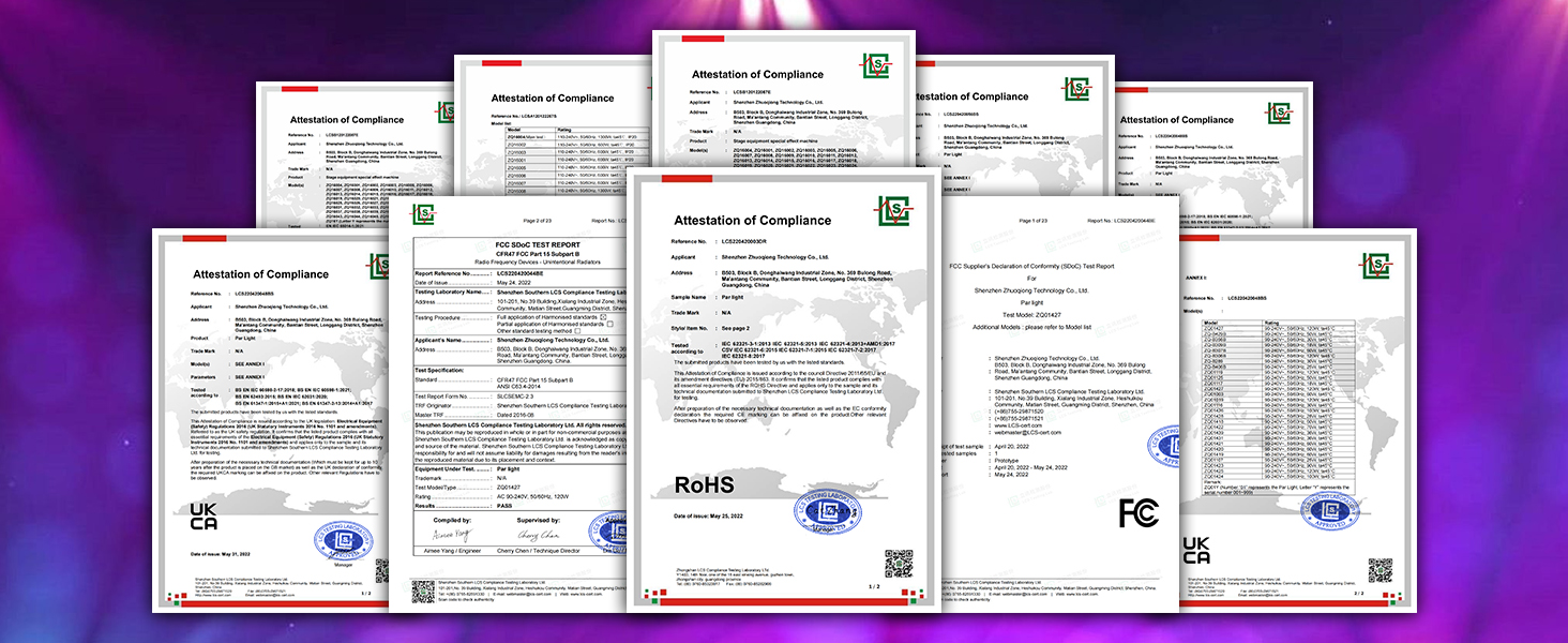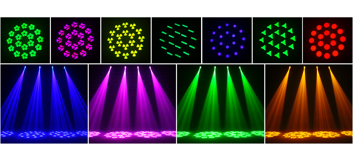 Steuerungsmodi Unterstützt mehrere Steuerungsmodi, darunter Auto, Soundaktiviert, Szene, Master-Slave und DMX; verfügt über eine elektronische Fokusfunktion, um klare Muster und Scheinwerfer in jeder Entfernung darzustellen.