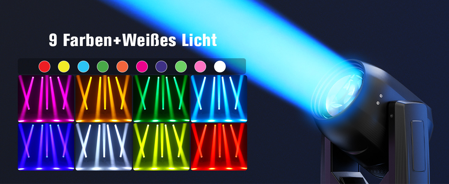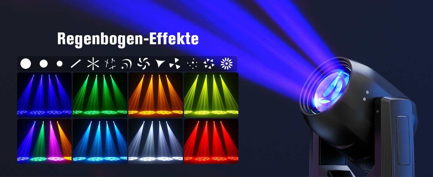 Mehrere Lichteffekte Kommt mit einem 9+1-Farbrad, einem 13+1-Goborad, 18 Prismen und Regenbogeneffekt, wodurch verschiedene Effektkombinationen möglich sind. Außerdem kann es Halbfarben- und Schütteleffekte erzeugen.