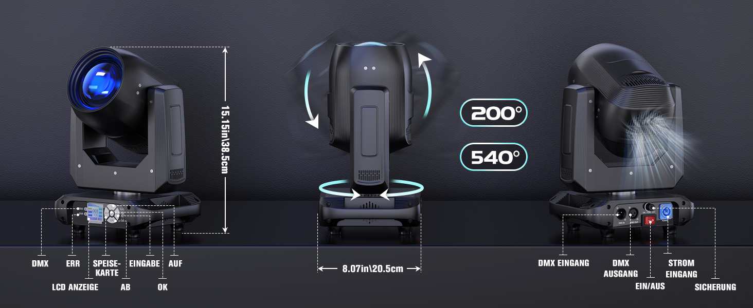 Intelligentes Zurücksetzen Ausgestattet mit RDM-Funktion, intelligenter Reset-Funktion auf der XY-Achse, einstellbarer Empfindlichkeit für Soundaktivierung und Möglichkeit zur manuellen Steuerung (Szenenmodus) und Speicherung von bis zu 10 Szenen; hohe Präzision mit horizontalem Scan von 540° und vertikalem Scan von 200°;