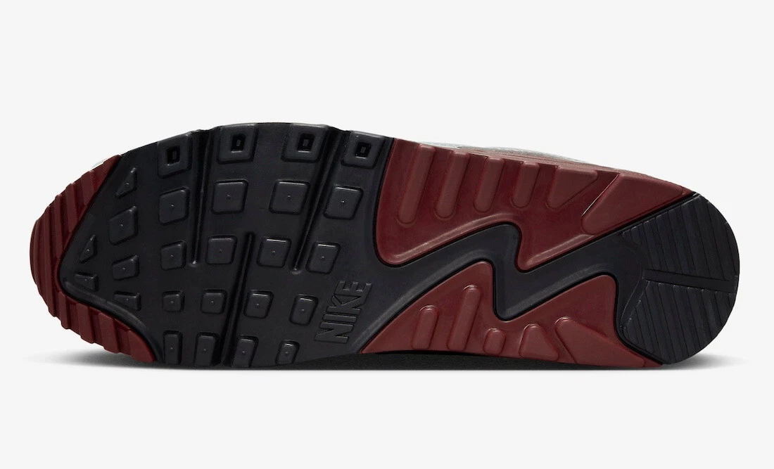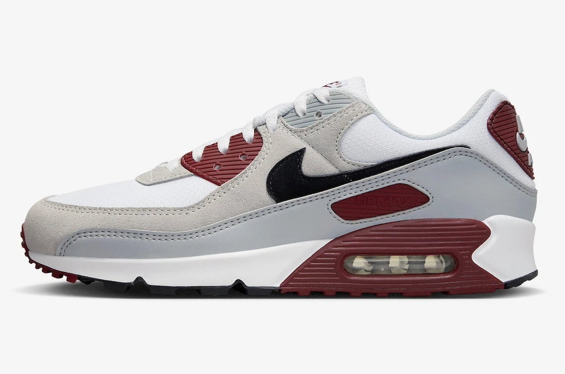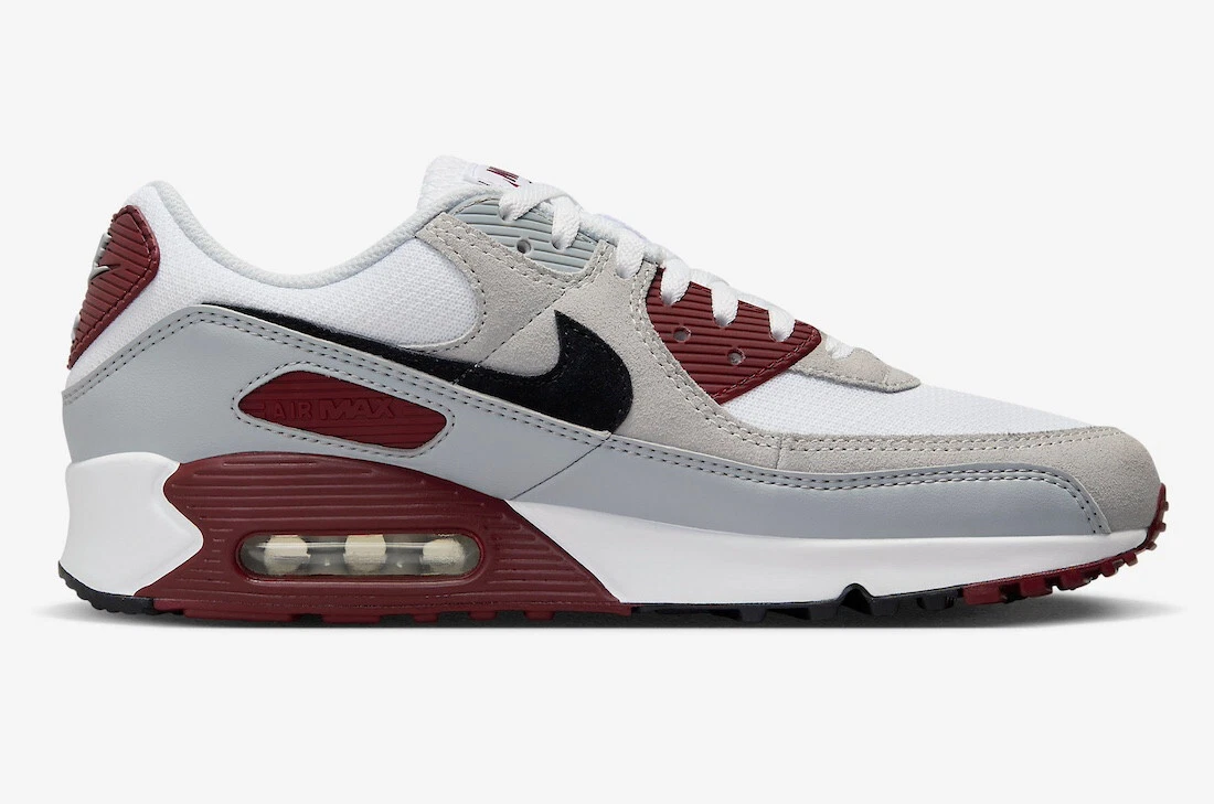 Während bei dieser Lieferung ausschließlich Wildleder-Overlays verwendet wurden, sorgt die Marke Beaverton beim Air Max 90 mit einem grauen Leder-Schutzblech für Abwechslung. Vertrautes weißes Mesh bildet die Basis des Schuhs und sitzt unter einem Wildleder-Viertelpanel und Nike Swoosh, während rote Akzente vor allem auf dem Zwischensohlenkeil und der „Nike Air“-Lasche an der Ferse den Schuh vervollständigen.