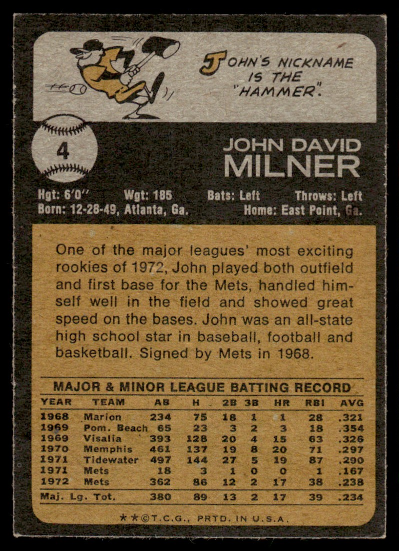| Description: | John Milner | | Category: | Baseball | | Year: | 1973 | | Product: | Topps | | Team: | New York Mets | | Card Number: | 4 | | Dimensions: | 3½" x 2½" | | SKU: | BL B0001 R01 E (4) |