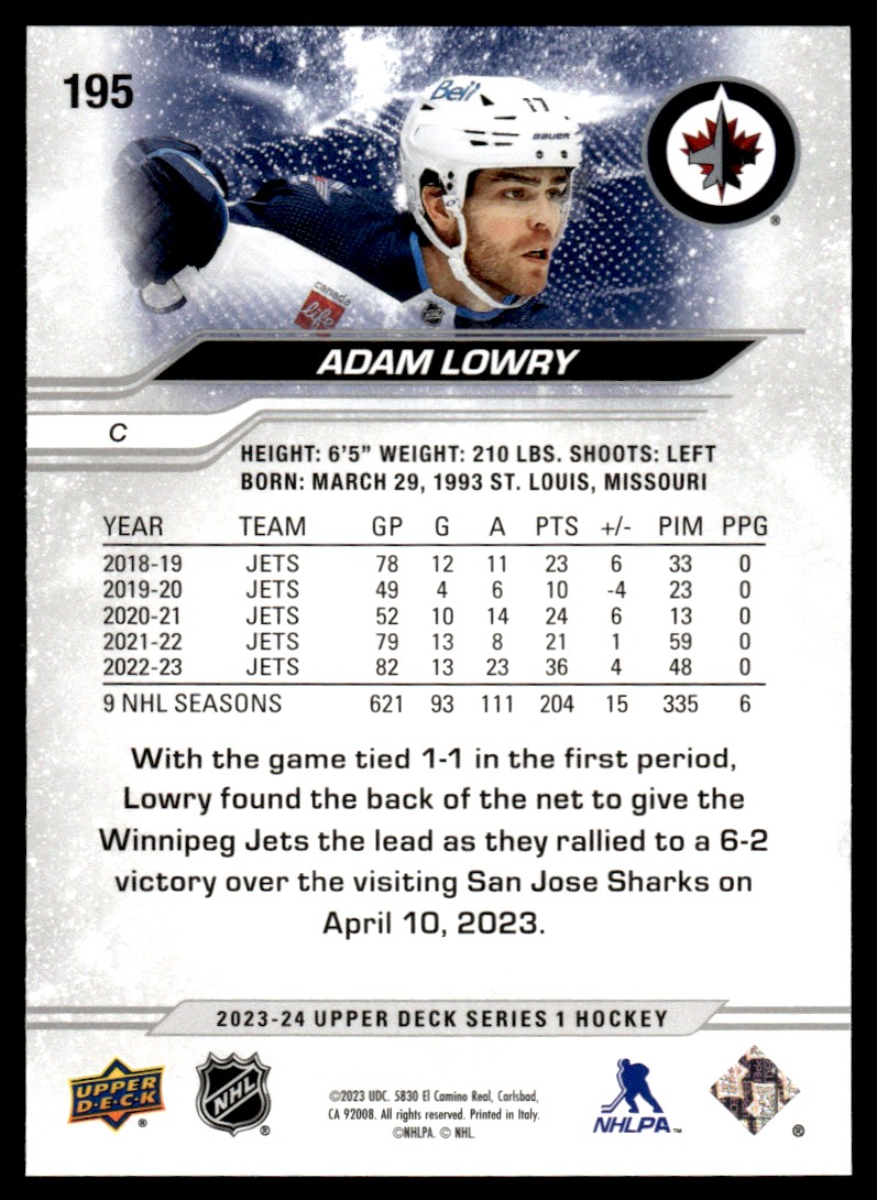 | 2023-24 Upper Deck Outburst Silver Adam Lowry Winnipeg Jets #195 |
