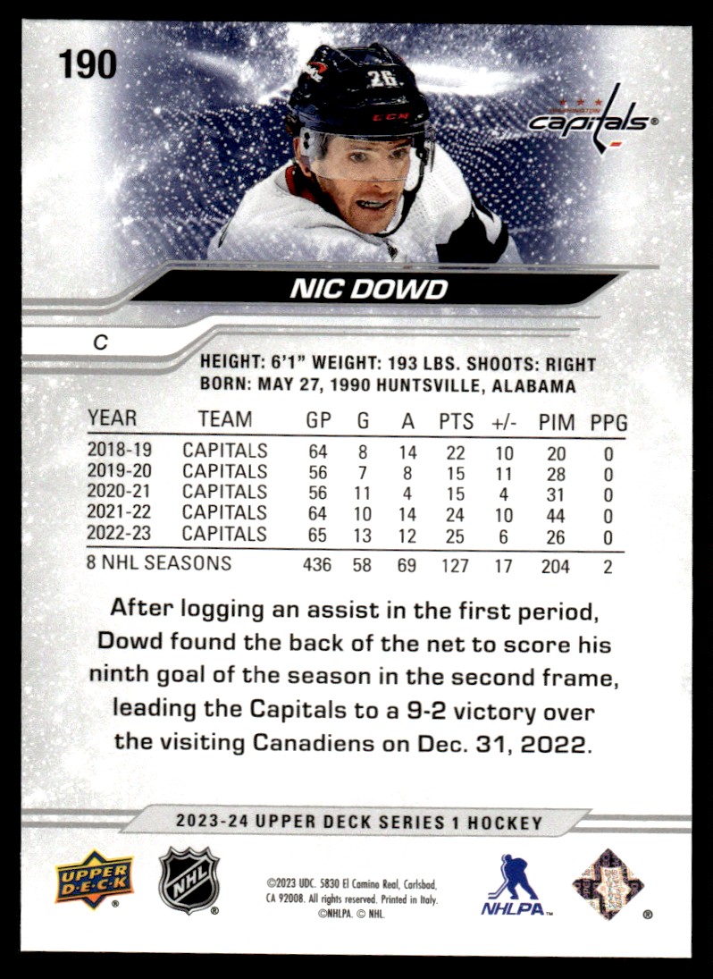 | 2023-24 Upper Deck Outburst Silver Nic Dowd Washington Capitals #190 |