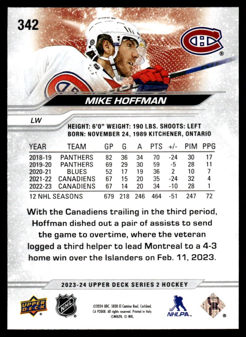 | 2023-24 Upper Deck Outburst Silver Mike Hoffman Montreal Canadiens #342 |