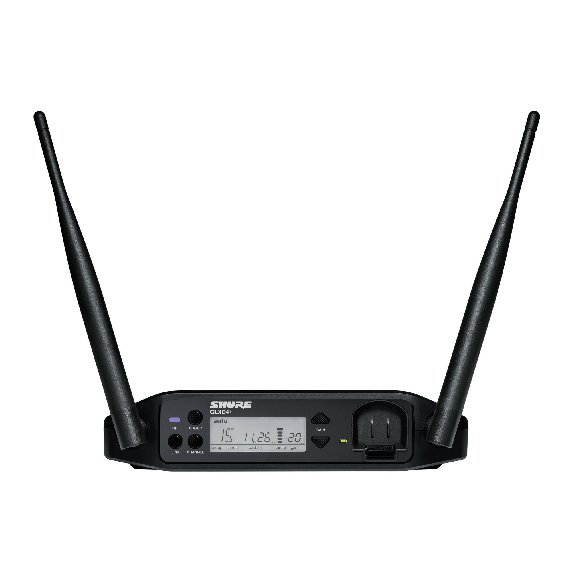 Featuring the industry standard BETA 58A vocal microphone, the new Shure GLXD24+/B58 Dual Band Vocal System delivers superior, transparent digital audio. The perfect combination of automatic frequency management with new Dual Band Technology provides reliable and consistent performance, while Shure proprietary Lithium-Ion rechargeable batteries provide up to 12 hours of use. This system works on a Z3 frequency band.