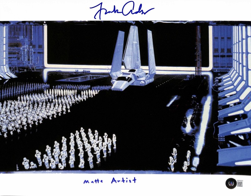 Autographed 11x14 color photograph signed in blue permanent marker by ILM Matte artist from Star Wars Return of the Jedi, Frank Ordaz. Insscribed “Matte Artist”.From the Steve Grad Autograph Collection and obtained in person by Steve at private signing with Frank in Marin County, Ca in 2013. The autograph has been certified by Beckett Authentication services #BJ013212
