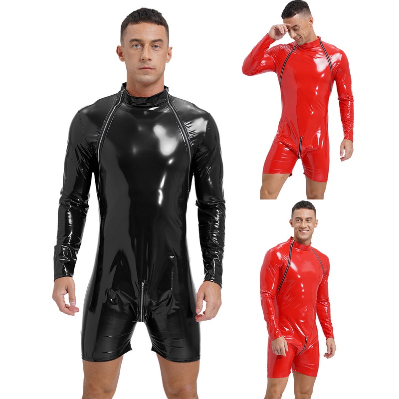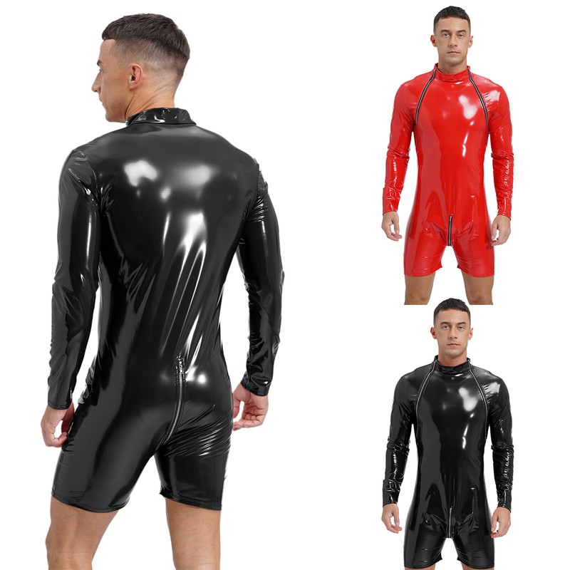 US Men's Faux Leather Wet Look Bodysuit Lingerie Long Sleeve Leotard Catsuit