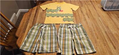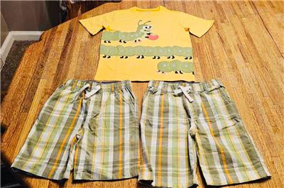 Love this cute shorts outfit from Gymboree! The caterpillar applique on the shirt is very nice quality and a generous size 6. The shorts were in the coordinating celery green and sunflower yellow plaid in sizes 4T and 5T. The shirt and shorts are brand new but washed, I purchased both sizes to make sure one would fit. I don't think they were ever worn. All three pieces are in perfect condition.