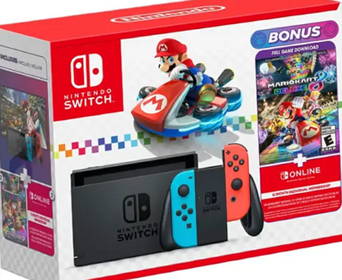 Bring home the fun with a Nintendo Switch: Mario Kart 8 Deluxe Bundle —an added value of $79.98. Nintendo Switch: Mario Kart 8 Deluxe Bundle. Nintendo Switch bundle includes a console, the Mario Kart 8 Deluxe game, and 12 months of Nintendo Switch Online. This bundle has everything you need to start playing right away, including a Nintendo Switch system with Neon Red and Neon Blue Joy-Con controllers.