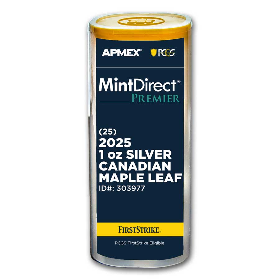Partnership with PCGSAfter an initial quality check, the sealed coins from the mint boxes are placed into a special machine for final sealing to ensure that the products you receive are totally sealed after being removed directly from the mint boxes. The tubes are fed into the machine on a conveyor belt, and both ends of each tube are sealed with tamper-evident packaging using a unique serialized hologram seal. The MintDirect® Premier coins come in very special, hard-to-find brown boxes that are also sealed with tamper-proof holograms that were designed specifically for the MintDirect ® process. The tube is then removed from the machine, and it's inspected to verify that the packaging meets our exacting criteria. You now have a completed MintDirect® Premier + PCGS FirstStrike® 2025 1 oz Silver Maple Leaf coin tube.
