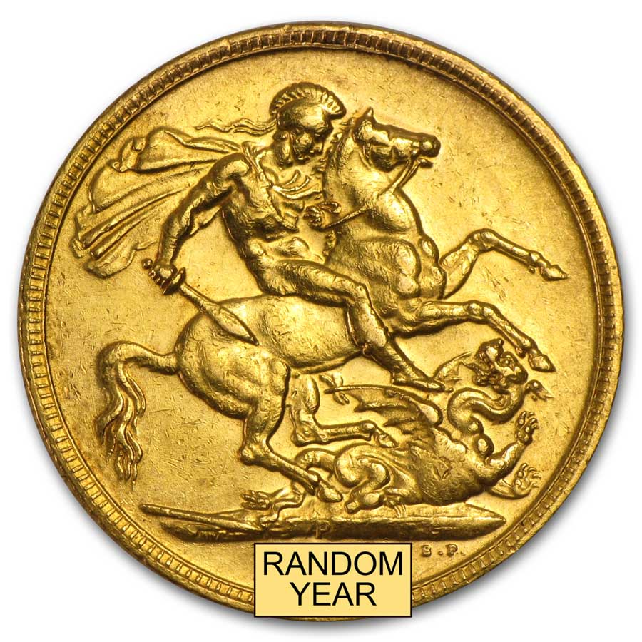- Reverse: A rendition of St. George mounted on horseback slaying a dragon, designed by Benedetto Pistrucci.