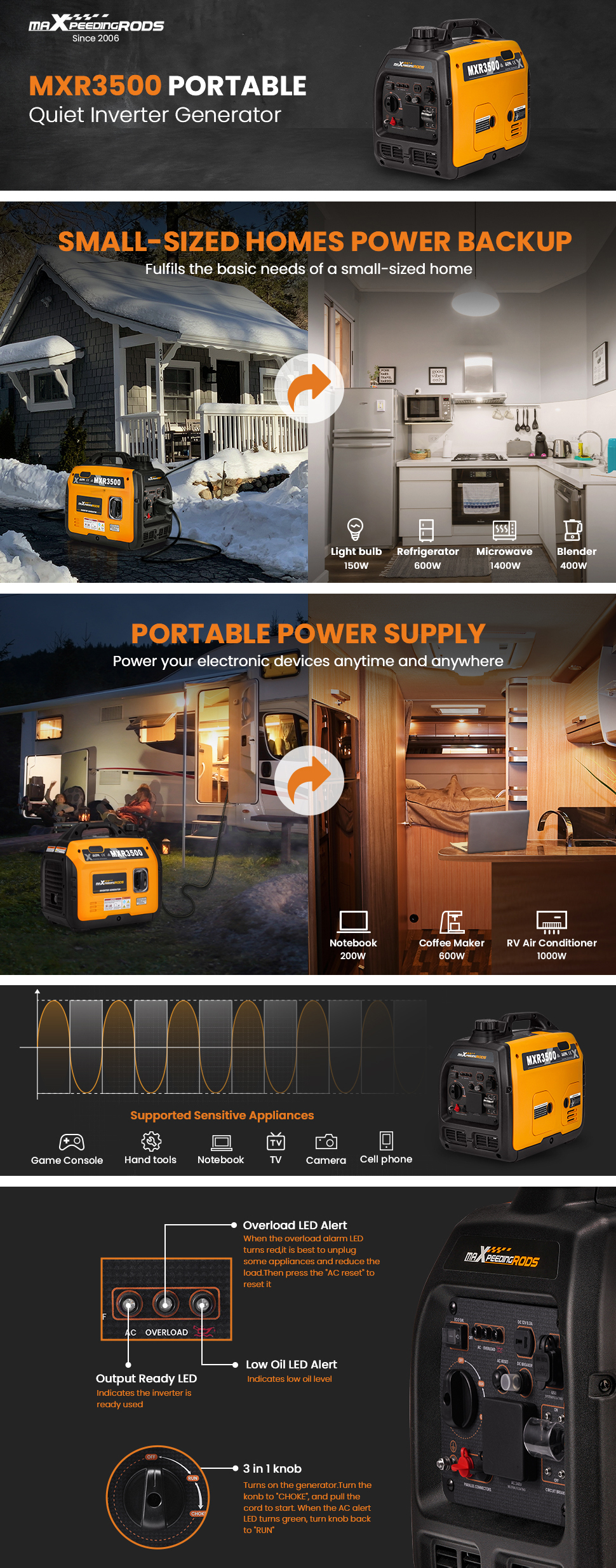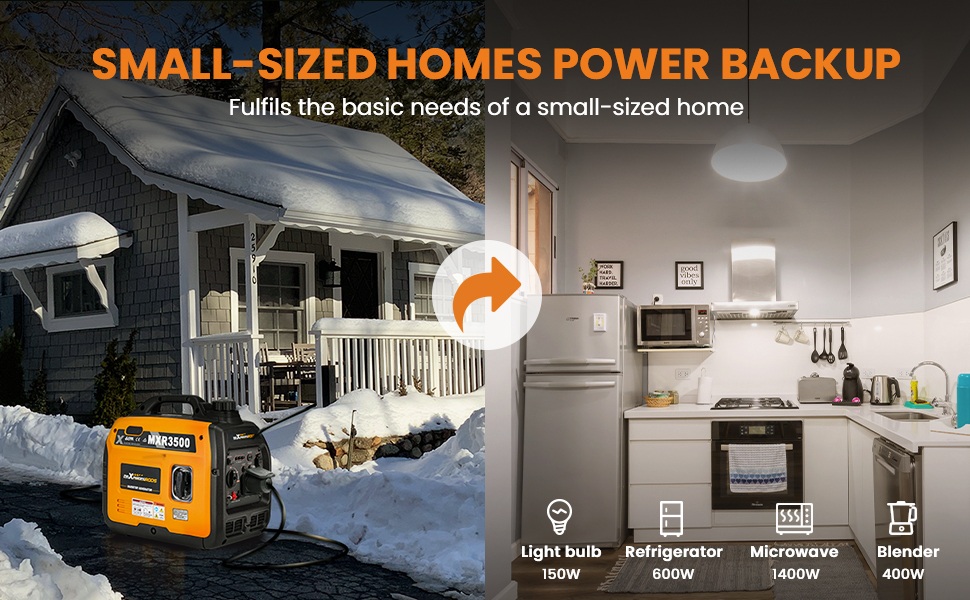 *Powerful generator:3500 peak watts, 3000 rated watts and up to 8.3 hours run time