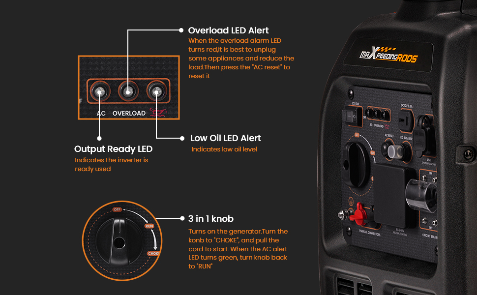 1.Alert:Overload, low oil and Output ready LED Alert