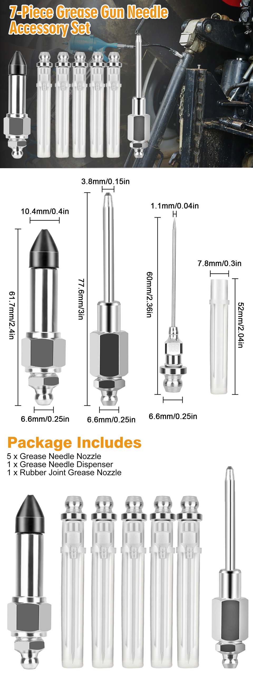 | Type | Grease Gun Needle Accessory Set | | Material | Carbon Steel | | Color | Silver | | Size(Length) | | | Grease Needle | 6cm/2.36 inch | | Grease Needle Dispenser | 7.6cm/2.99 inch | | Rubber Joint Grease Nozzle | 6cm/2.36 inch |