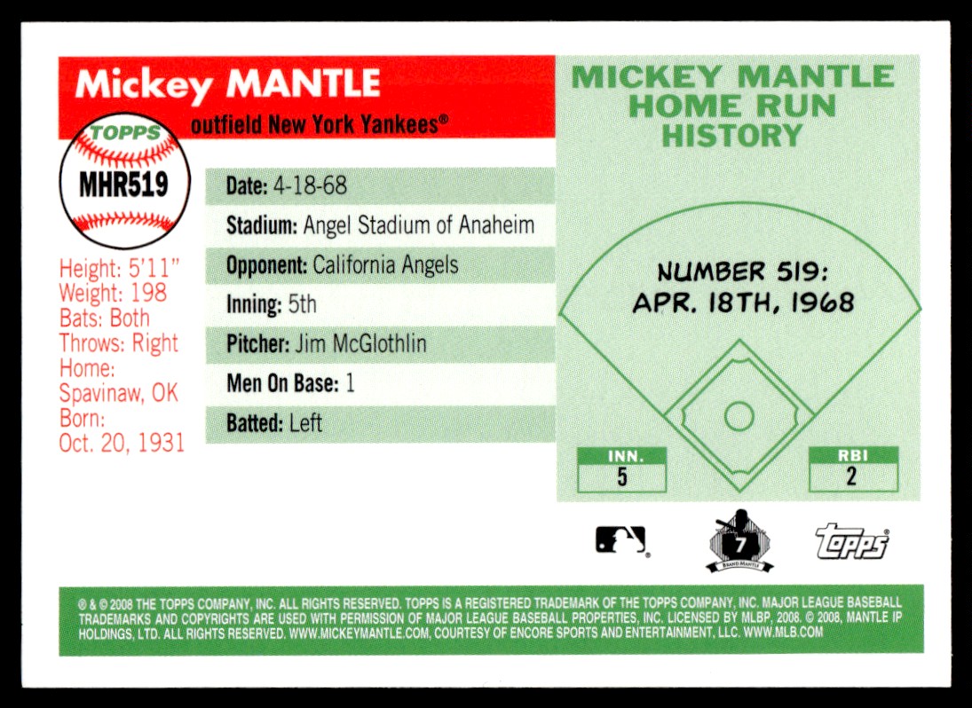 2008 Topps Mickey Mantle Home Run History Mickey Mantle New York Yankees #MHR532