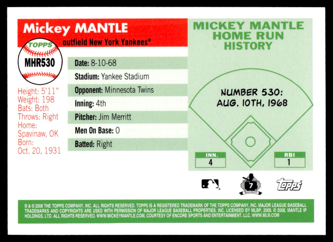2008 Topps Mickey Mantle Home Run History Mickey Mantle New York Yankees #MHR530