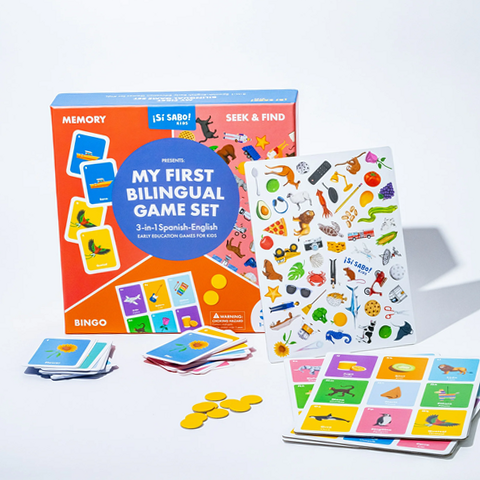 Teach your ninos Spanish and English with this 3-in-1 family game set! Great for kids, and fun for family members of all ages. Through interactive games your kids already love, including Bingo, Memory Matching and a Seek & Find Puzzle, your little ones can enhance observational and attention skills, build fine motor skills and learn a new language. Created by bestselling author Mike Alfaro of Millennial Lotería fame, Sí Sabo Kids builds early language skills celebrating Latin culture. It's the perfect introduction for kids to discover Spanish through sight, sound and touch.