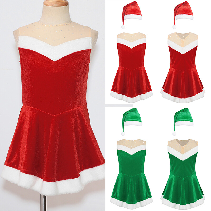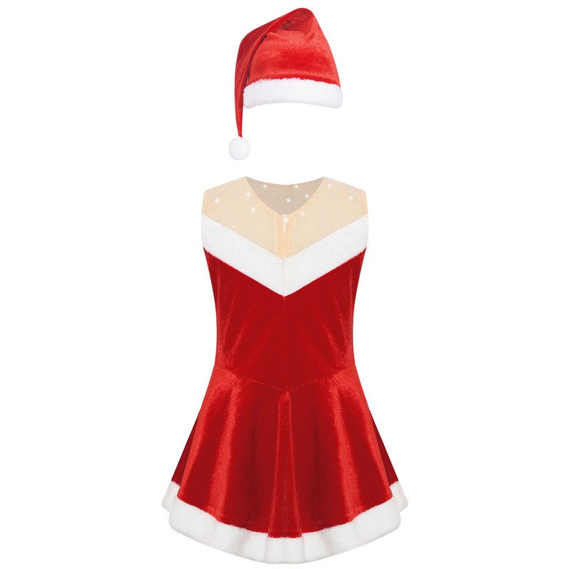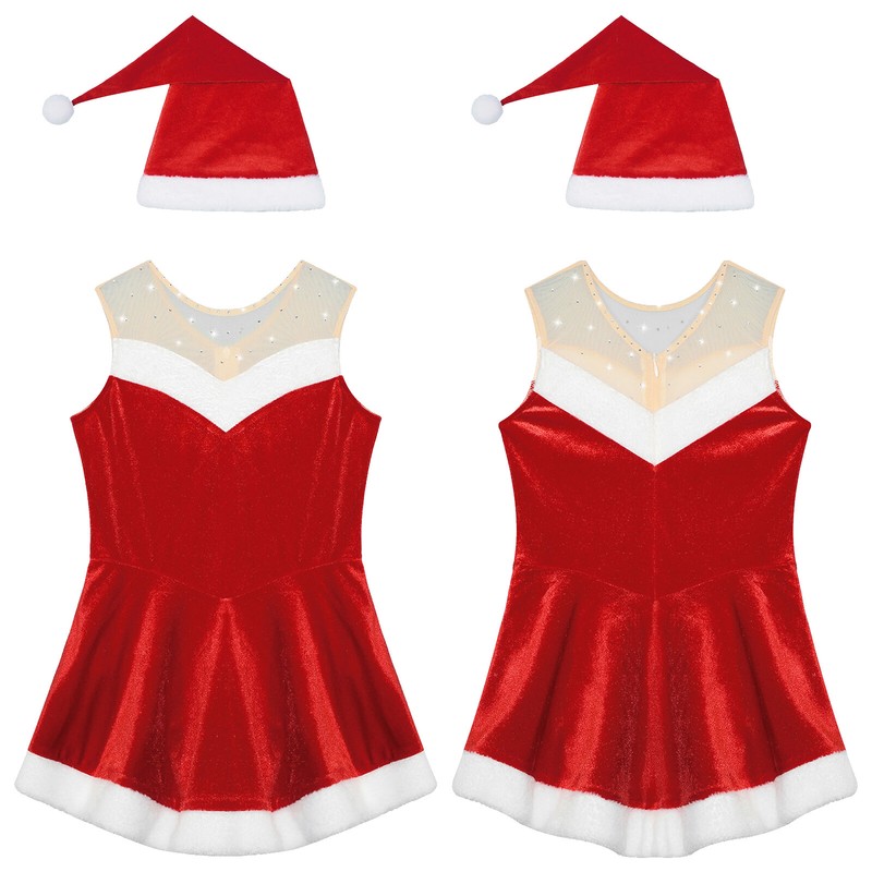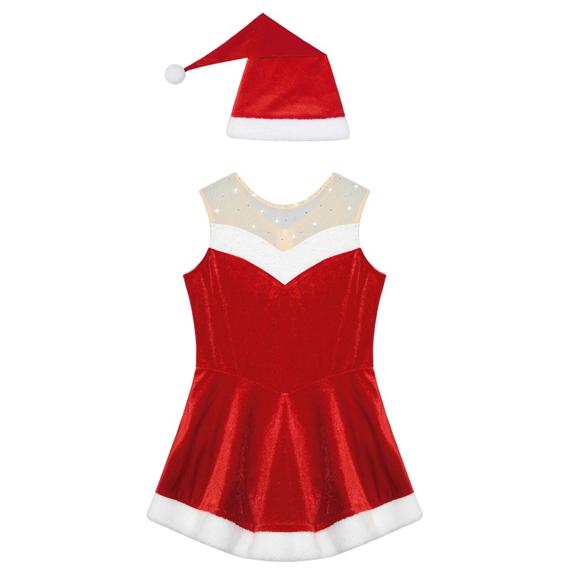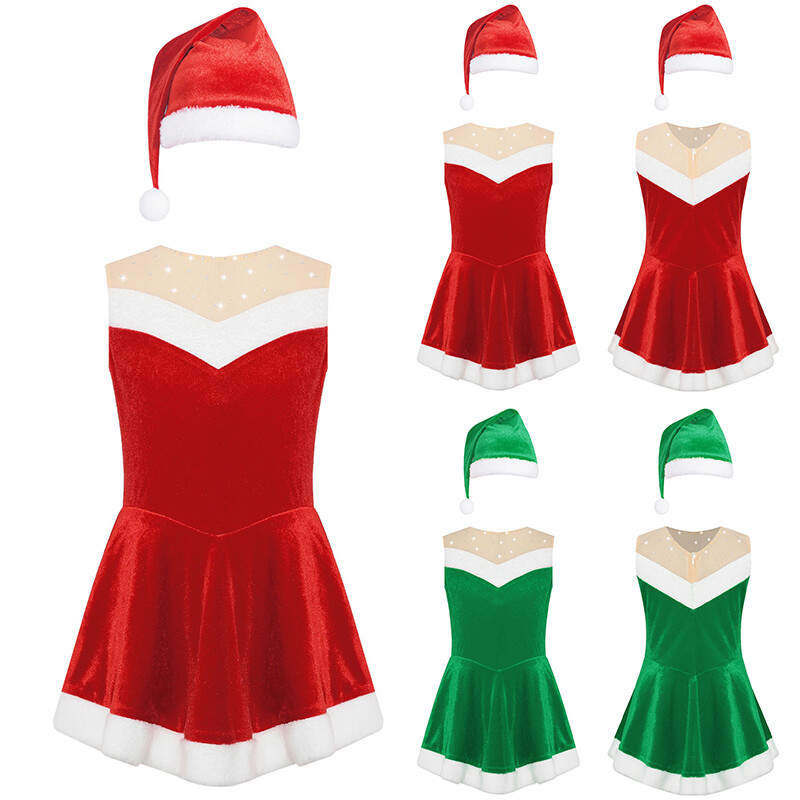 Kids Girl Christmas Dance Costume Sequin Dress Bodysuit Dancewear with Santa Hat