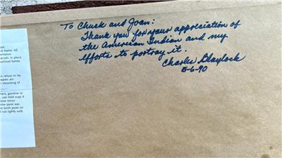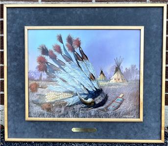 Nice oil on canvas by Charles Blaylock (Illinois/Arizona 1937-2006), Indian Headdress and Relics, 1989, signed and dated lower right. This is in good condition, approx. 19 1/2" wide by 15" high, with inscription verso. Frame is approx. 29"w x 25"h.