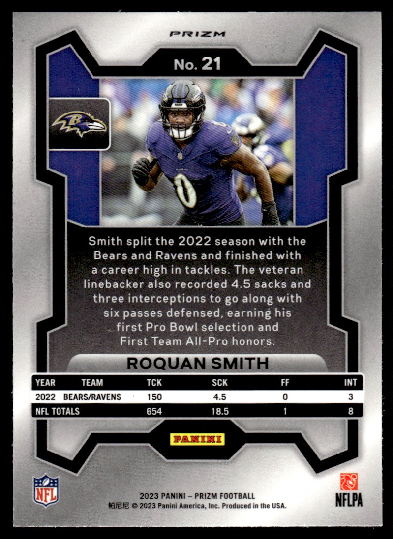 2023 Panini Prizm Purple Pulsar Roquan Smith Baltimore Ravens #21